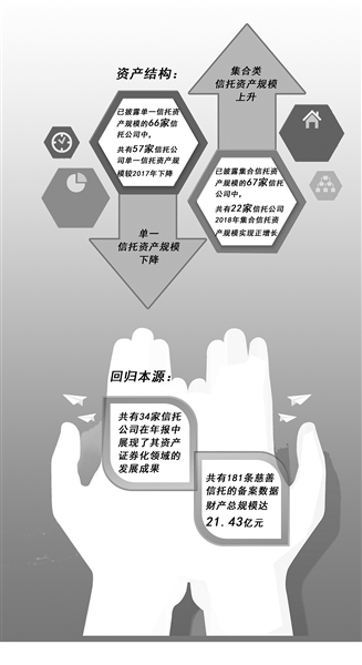 国内68家信托公司2018年年报数据已全部披露完成。《金融时报》记者梳理年报后发现,2018年,业内信托公司在加速回归本源业务的基础上,主动管理能力持续增强,并在家族信托、慈善信托、资产证券化、消费金融等新领域、新方向和新模式上,进一步加大了探索力度,整个信托行业转型成效显现。