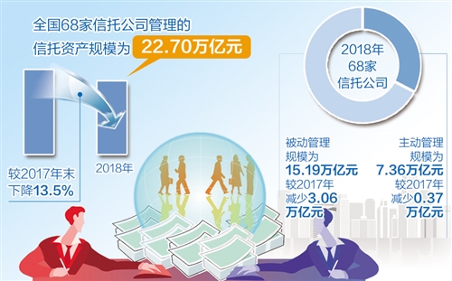 2018年,在监管“去杠杆、去通道、减嵌套”政策导向下,各信托公司主动收缩通道业务,进一步优化业务结构。与之同步的是,信托资产规模下降。数据显示,全国68家信托公司管理的信托资产规模为22.70万亿元,较2017年末的26.25万亿元同比下降13.5%。