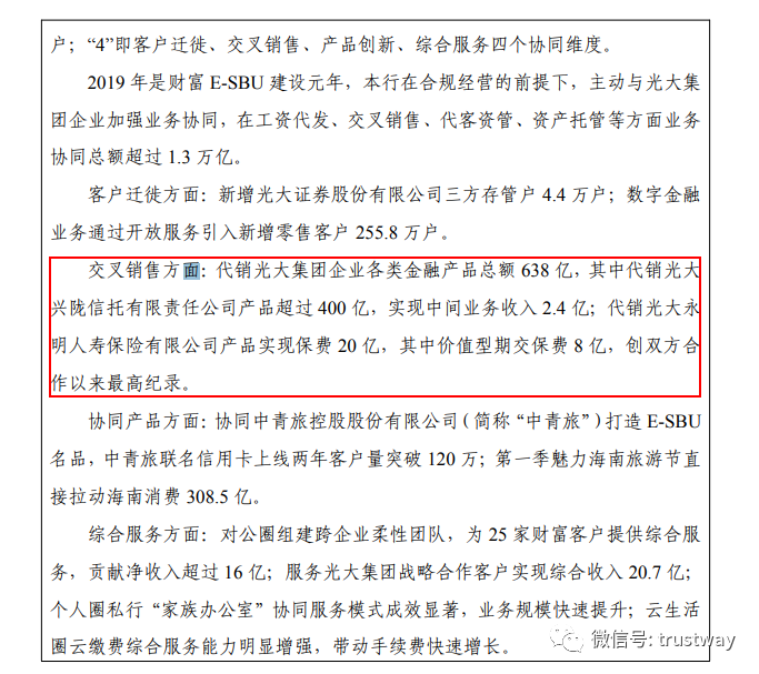根据光大银行年报,2019年,该行代销光大集团企业各类金融产品总额638亿,其中代销光大兴陇信托有限责任公司产品超过400亿,实现中间业务收入2.4亿;代销光大永明人寿保险有限公司产品实现保费20亿,其中价值型期交保费8亿,创双方合作以来最高纪录。