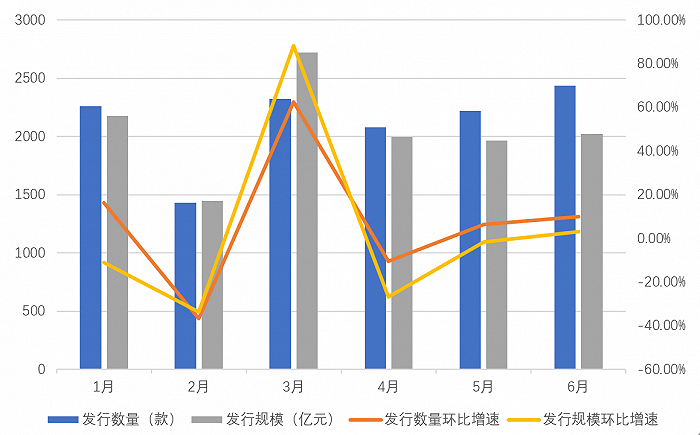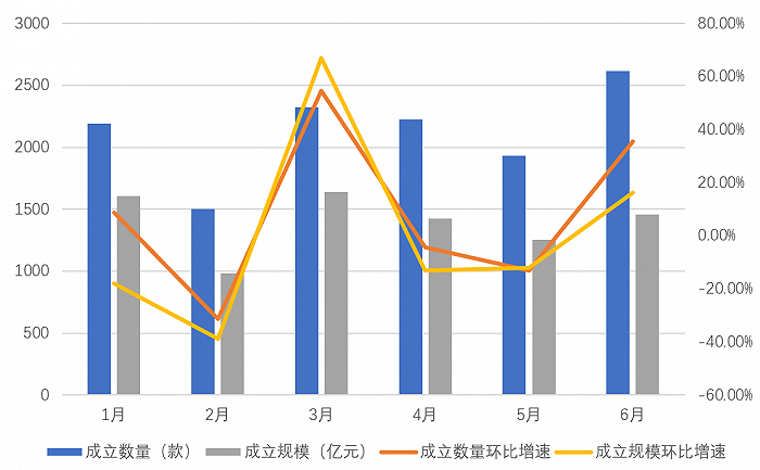 发行高峰期的3月是新产品成立规模最高的月份,达1640.88亿元。1月虽然较去年12月有所下降,但是成立规模在上半年仍排第二位,达1606.65亿元。成立数量来看,6月成立数量达2614款,位居上半年榜首。